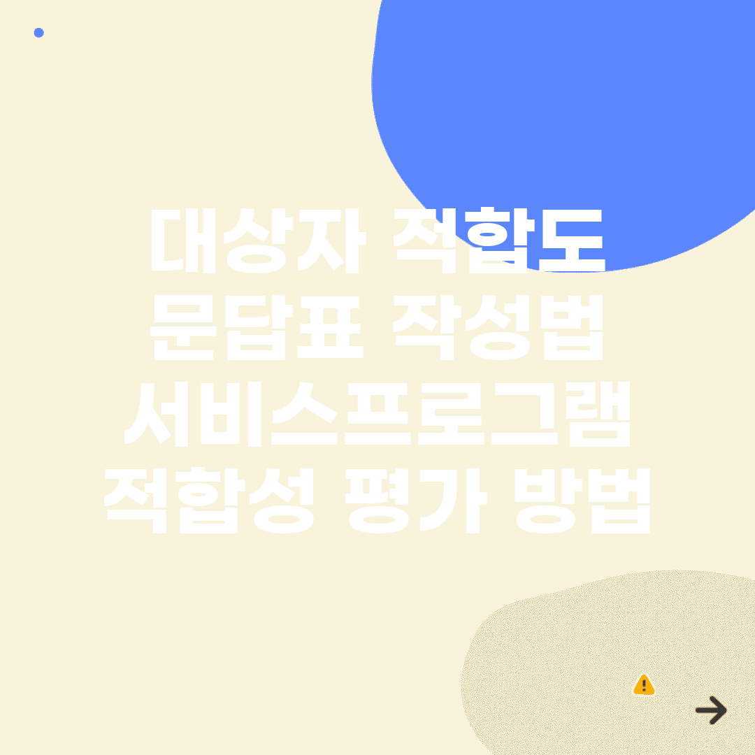서비스나 프로그램의 적합성을 평가하기 위해 대상자 적합도 문답표를 작성하는 것은 매우 중요합니다. 적합성 평가 방법에 따라 선정된 문답 기준은 고객의 필요를 충족하는 데 큰 도움이 됩니다.