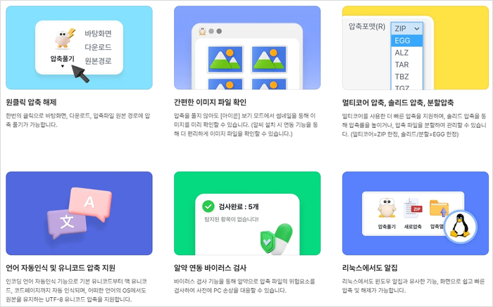 ZIP, RAR, EGG, ALZ 등 수많은 파일 포맷을 자유자재로 다룰 수 있는 알집은 파일 압축에 대한 모든 고민을 말끔히 해결해 줄 것입니다.