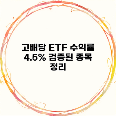 고배당 ETF에 투자하는 것은 안정적인 수익을 추구하는 많은 투자자들에게 매력적인 선택이 되었어요. 특히 이렇게 4.5% 이상의 수익률을 자랑하는 검증된 종목들은 더욱 관심을 끌고 있죠. 이 글에서는 고배당 ETF에 대한 기본 개념부터 다양한 종목, 그리고 투자할 때 유의해야 할 점들을 차근차근 살펴보도록 할게요.
