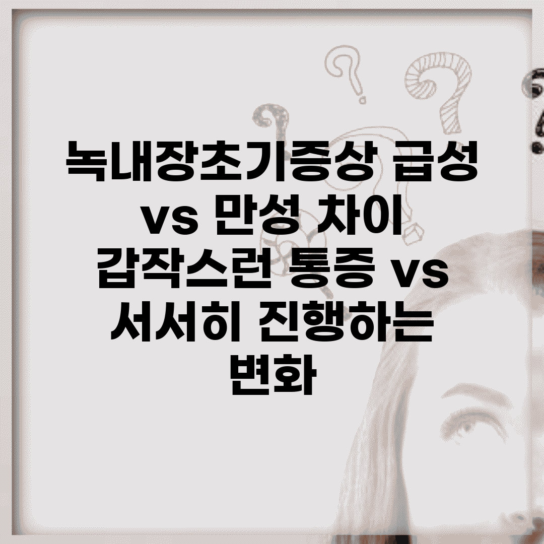 A: 급성 녹내장은 갑작스런 통증과 급격한 시력 저하를 특징으로 하고, 만성 녹내장은 서서히 증상이 진행되어 초기에는 증상을 느끼지 못하는 경우가 많습니다.